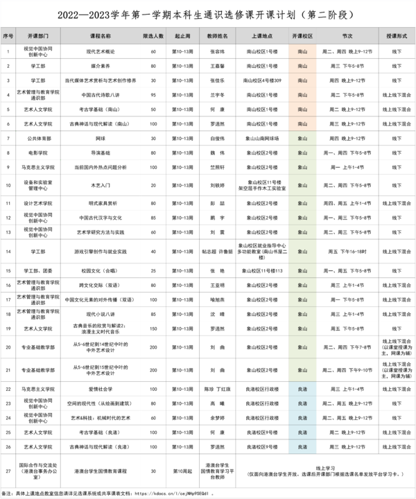 根据本学期教学计划,于2022年10月27日—10月29日进行2022—2023学年第一学期本科生通识类选修课(第二阶段)网上选课。具体安排如下: